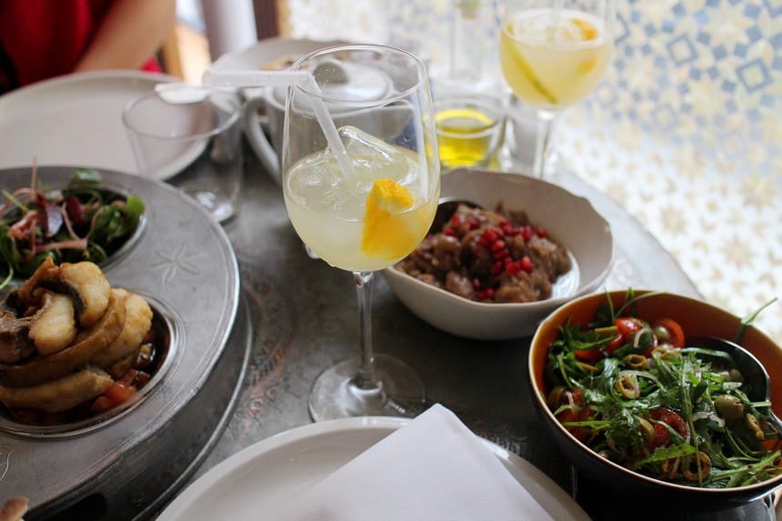 La carte du midi change tous les mois et revisite de nombreux plats traditionnels. Nous nous sommes régalés avec l’assortiment de mezzés du moment : hommos, moussaka, chmandar (un mélange betterave/haricots plats/chou blanc), kebbit laktine (à base de potiron) et poisson du jour. Mention spéciale aussi au Daoud Bacha qui nous a littéralement fait succomber ! Nous n’avons pas fait l’impasse sur le dessert (gourmandes jusqu’au bout), composé lui aussi de plusieurs bouchées : un délice à partager (ou pas) !