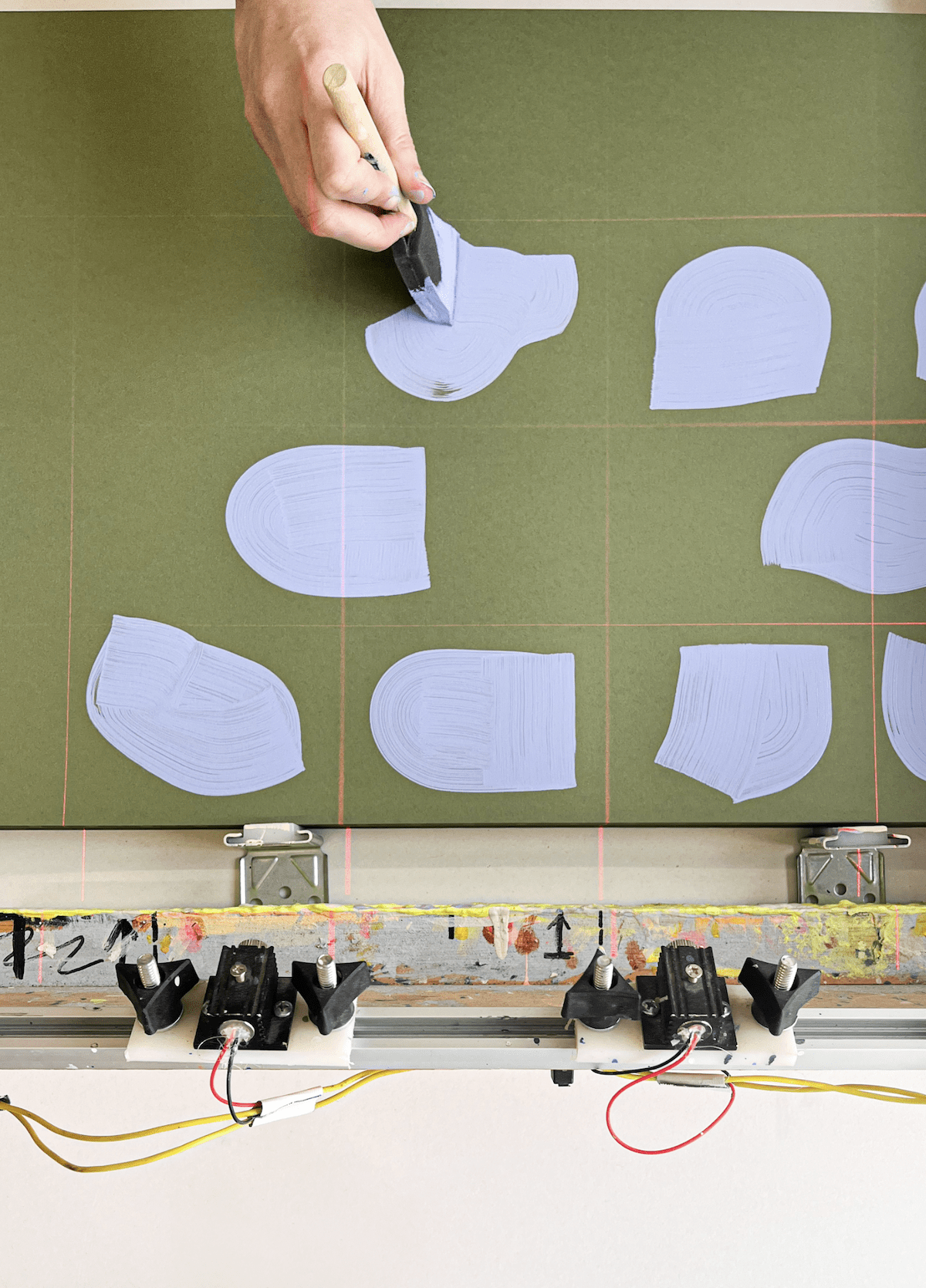 Je peins et dessine beaucoup avant chaque collection. Les motifs et jeux de textures de la ligne sont le résultat de ces expérimentations. Je peins habituellement avec de la musique d’ailleurs, car cela accompagne et oriente organiquement mon geste. Parfois, je pars d’une photo sauvegardée dans mon téléphone, je m’inspire énormément de la mode ainsi que des livres que je collectionne, des albums vintage de littérature jeunesse, par exemple. J’évite les réseaux sociaux et suis mon instinct. C’est lui qui me guide vers des couleurs fraîches et des compositions originales. J’aime la vivacité des nuances presque fluo combinée à des tonalités plus feutrées. J’applique soigneusement d’épaisses couches de peinture sur des feuilles de papier avant de les découper. Enfin, chaque pièce passe par l’une de nos presses artisanales où elle est estampillée, imprimée ou reliée.